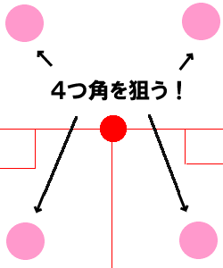 しかも、相手が取りにくい、4つ角だと、相手のボールが真ん中に来るので簡単に打つ事が出来るんです。